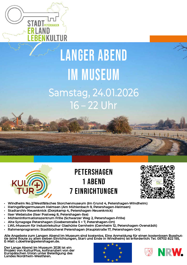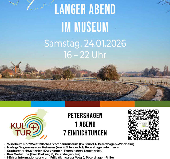 Im Rahmen des Kulturprogramms „Langer Abend im Museum“ öffnen am Samstag, den 24.01.2026, von 16 bis 22 Uhr sieben kulturelle Einrichtungen der Stadt Petershagen ihre Türen und laden zu Besichtigungen, Begegnungen und vielfältigen Aktionen ein.
